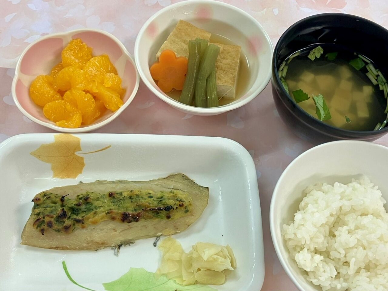 <昼食> ご飯、さわらの木の芽みそ焼き、春の炊き合わせ、みかん缶、すまし汁