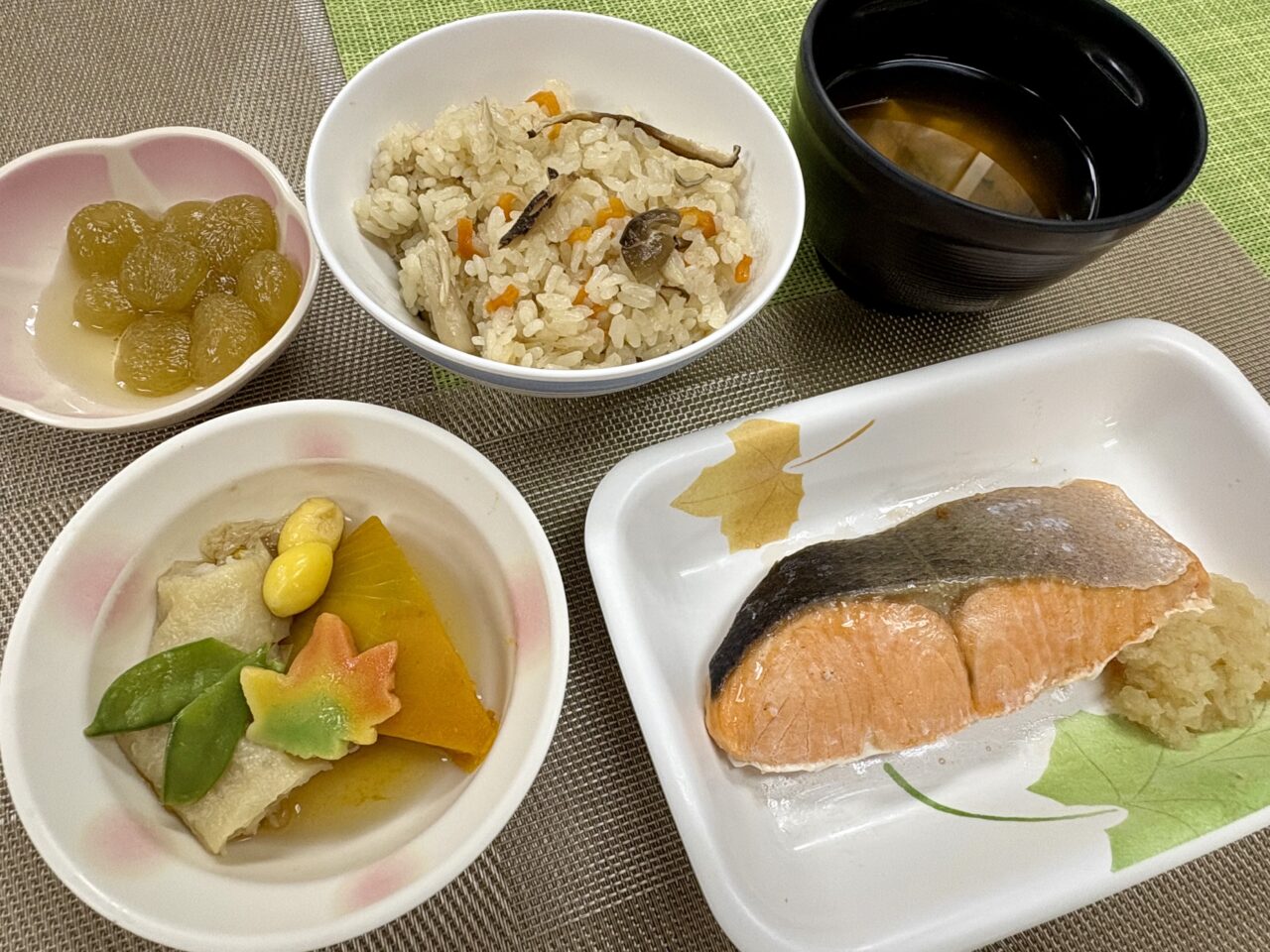 〈9月23日 昼食〉きのこご飯、鮭の塩焼き、秋の煮物、ぶどう缶、みそ汁