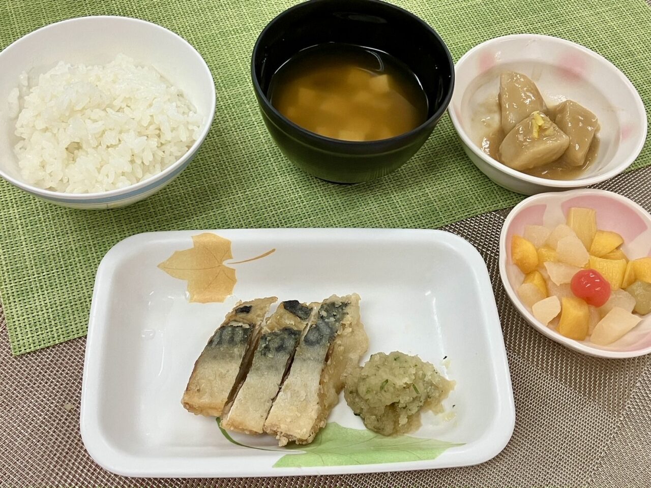 ご飯、秋さばの竜田揚げ、里芋の煮ころがし、フルーツカクテル缶、みそ汁