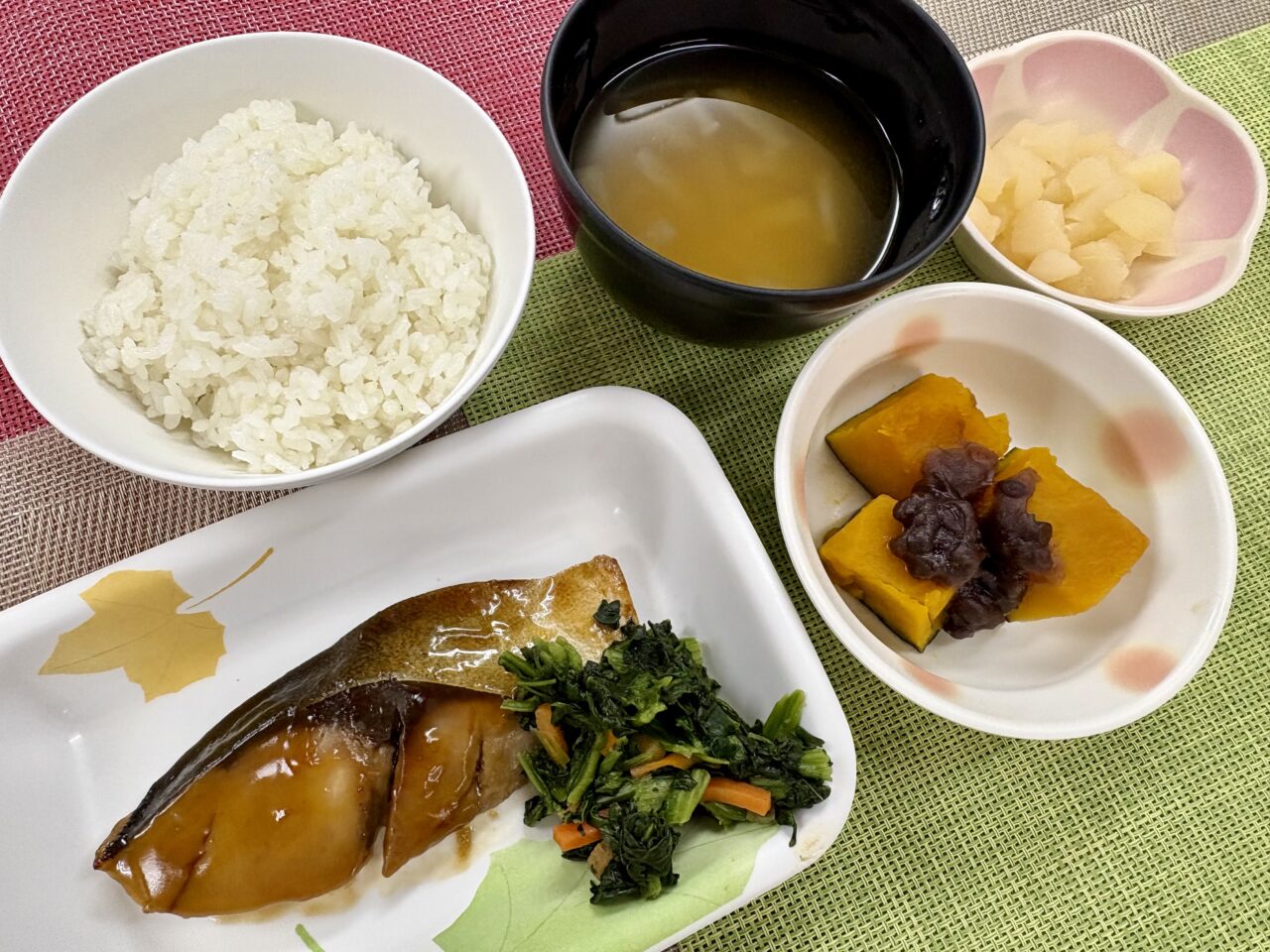 冬至献立 (ご飯、ブリの柚子胡椒焼き、かぼちゃのいとこ煮、洋梨缶、大根とえのきのみそ汁)