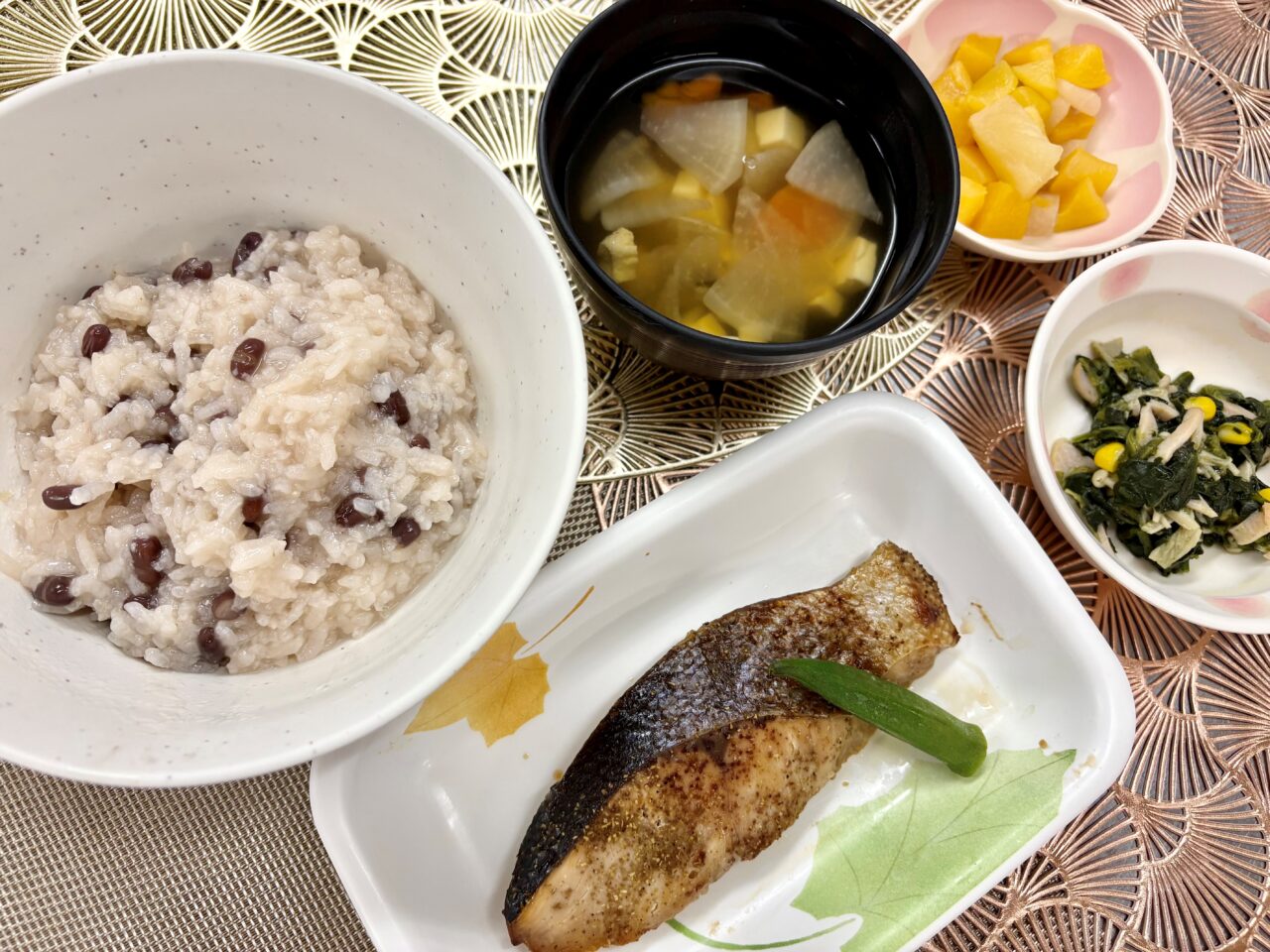 小正月献立(小豆粥、鮭の山椒焼き、ほうれん草ソテー、フルーツカクテル缶、けんちん汁)