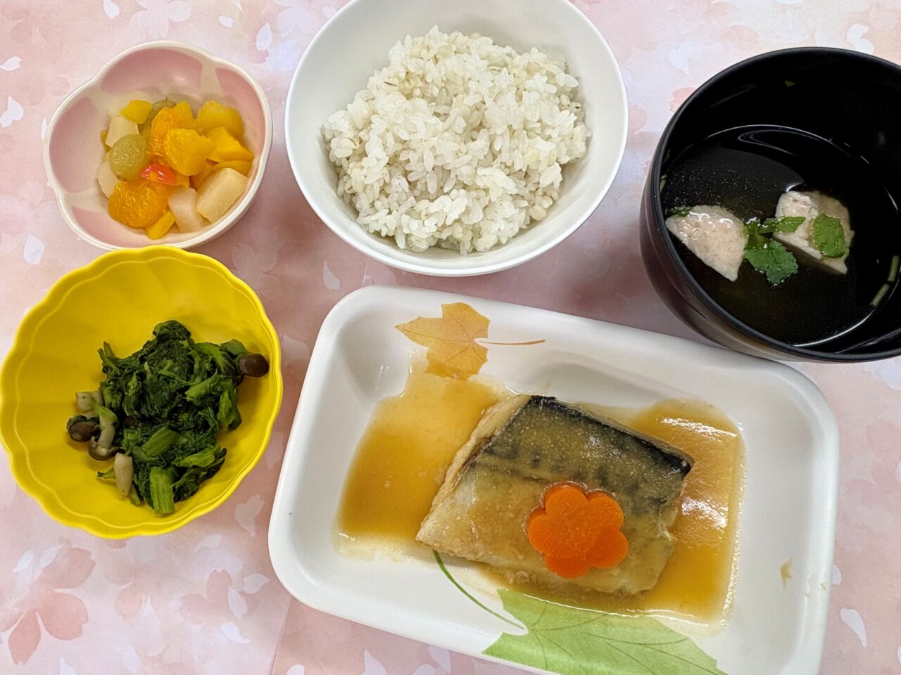 2月19日 雨水献立〈昼食〉麦ごはん、さばの味噌煮、菜の花辛し和え、フルーツカクテル缶、すまし汁